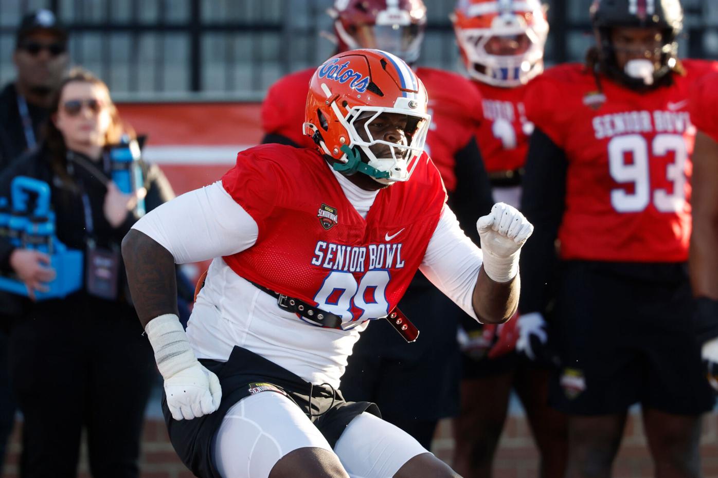 Florida defensive tackle Caleb Banks could and should be a top-20 pick. If there was a bit of ring-rust on day one, it was gone by the second practise. Banks dominated in an incredible show of power and quickness. He was constantly jawing with the O-liners too, making it clear who the top dog was.