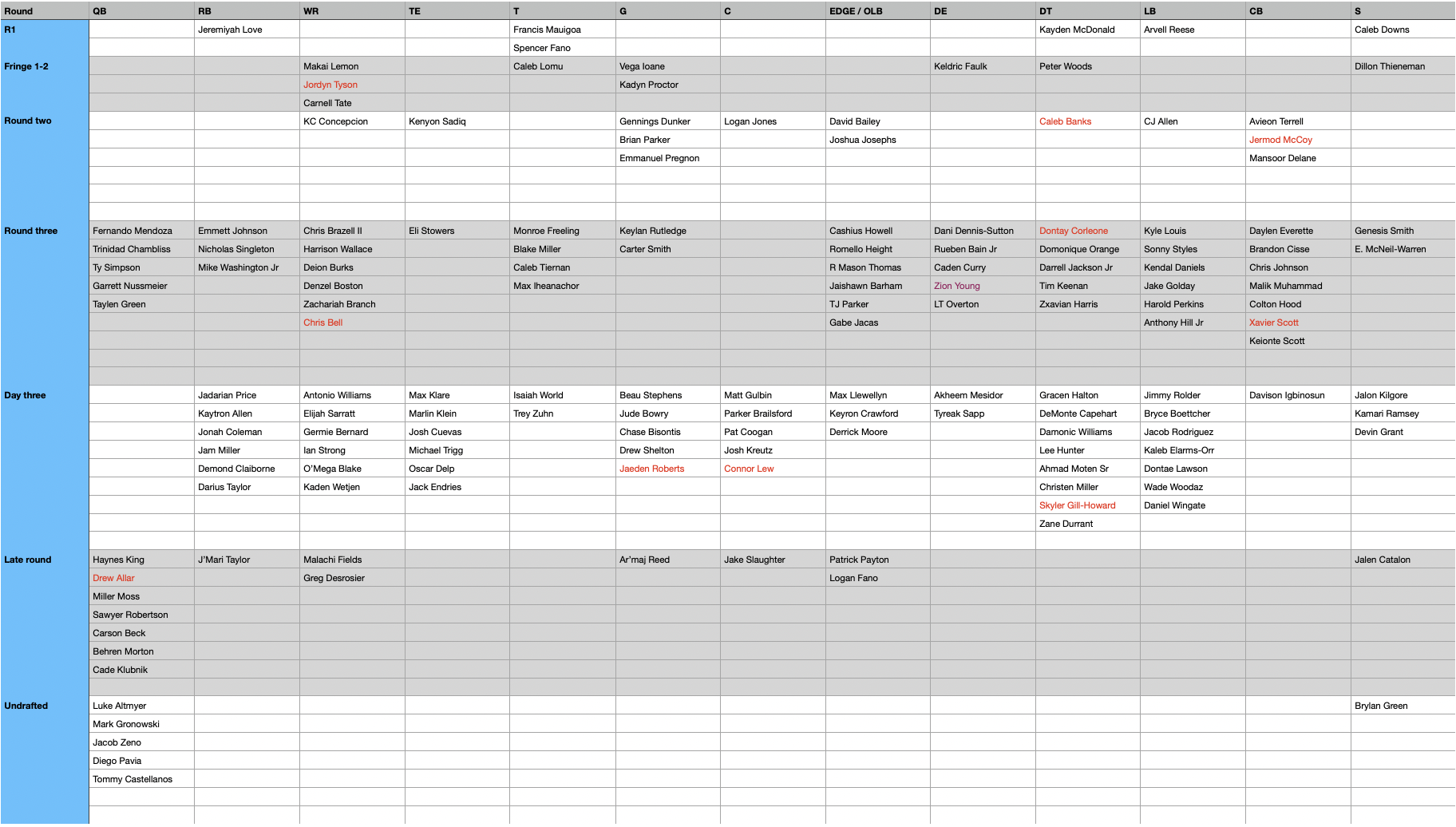 This is how I am currently grading individual players. Those marked in red either have current injuries or reported injury concerns/injury history. Those marked in purple have reported character related issues that would require investigation by a team.