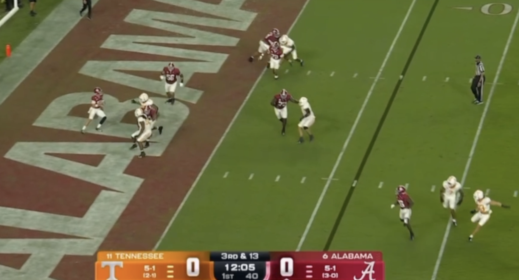 Let’s look at some plays against Tennessee. In this first clip, the left guard is beaten way too easily off the snap creating early pressure. Simpson is already having to pass from his own endzone. No problem: