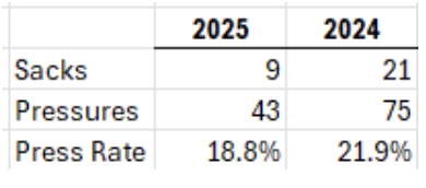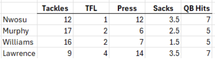 Both have been really underwhelming this season when you watch complete games. With Woods you’re left wondering where the dynamic potential game-wrecker has gone. He’s looked like a bog-standard run defender at times, offering little or no impact as a pass rusher. He’s had three games this year where he failed to record a single pressure and seven sack-less games too. It’s been six games since Faulk last had a sack and he only has two for the season.