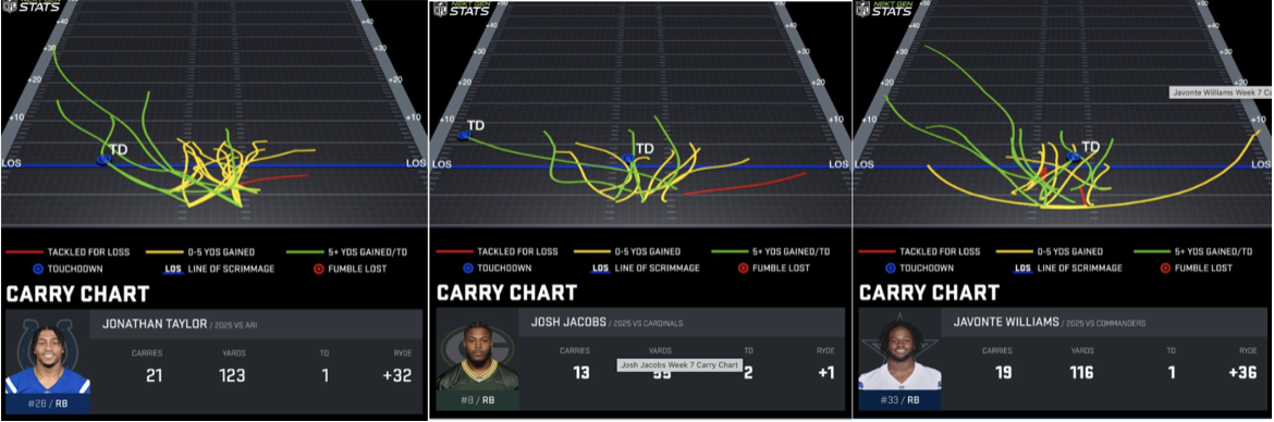 Raleek Brown (Arizona State) is undersized but loves to finish his runs, flashes explosive traits and can make dynamic cuts to exploit openings. Jadarian Price (Notre Dame) also has a fair amount of talent and has been a great complement to Love. I see Kaytron Allen (Penn State) and Jonah Coleman (Washington) more as day-three prospects but they’ll have a chance to stick in the league.