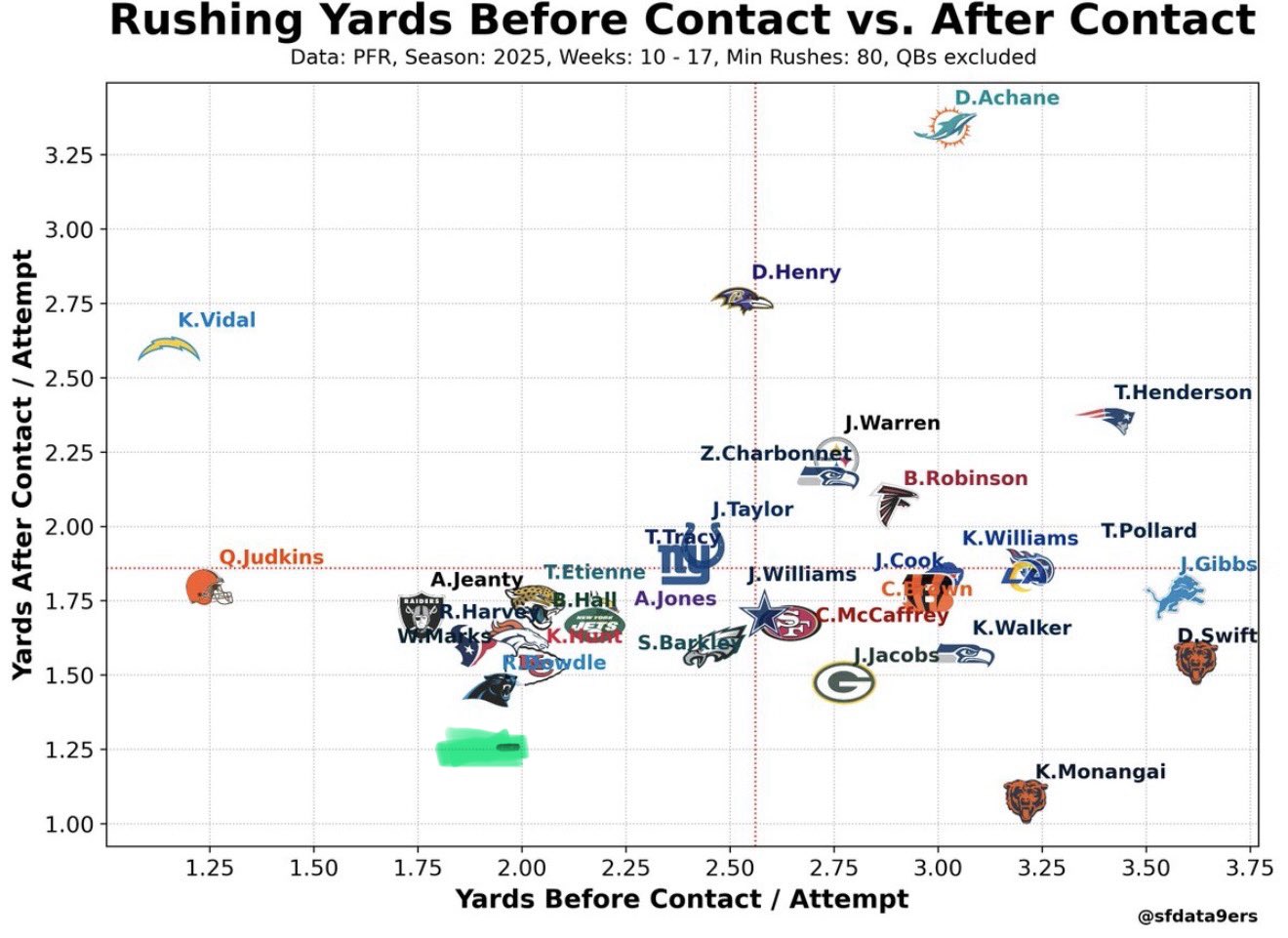 If you’re in the market for a really good running back next year, there’s one solution if you’re not in position to get Love early in round one. Call the Dolphins about Achane. I don’t think people realise just how good he is. A lot of people scoffed at a second round price tag at the trade deadline. With hindsight — I think a good team should’ve pulled the trigger: